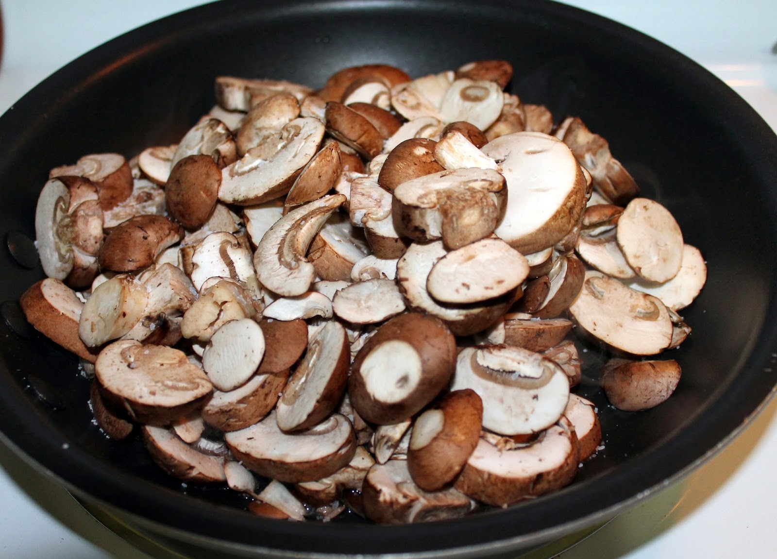 In another skillet, heat a tablespoon of olive oil and begin cooking your mushrooms. Add a little salt and let them cook for around 15-20 minutes. Turn them periodically.