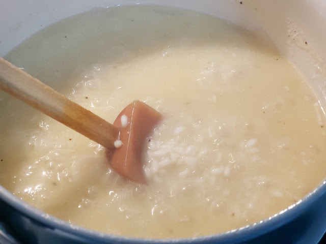 Add the chicken broth to the rice one cup at a time, stirring constantly. You will be amazed at how much the rice "grows" in the pot.